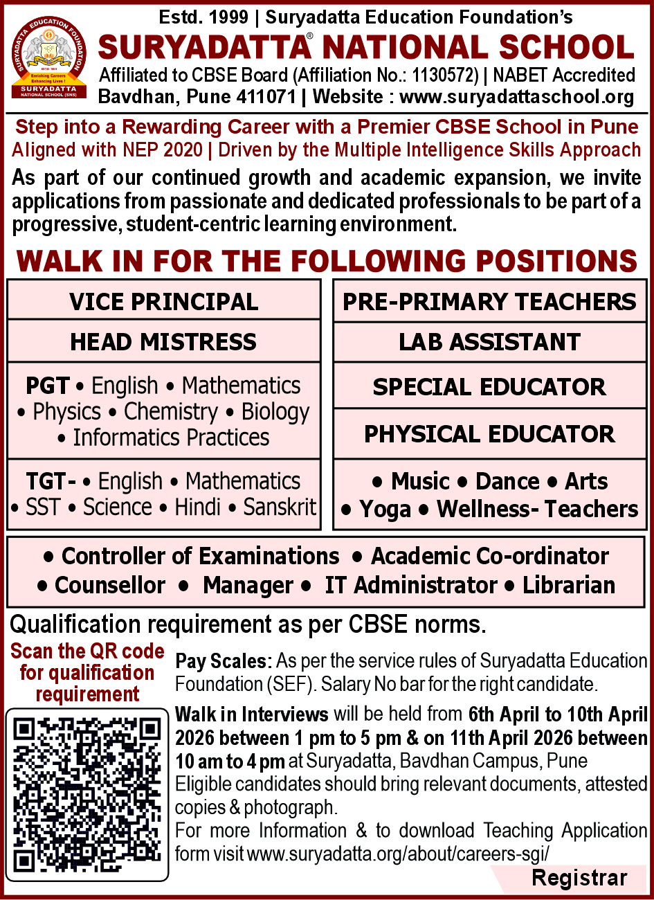 Suryadatta National School invites applications from qualified and experienced academics for the position of teachers for all subjects of CBSE from Nursery to Class XII. Applicants must possess relevant and prescribed qualifications as per category applied for and should have adequate experience of teaching in CBSE schools. Fluency in English is a must.